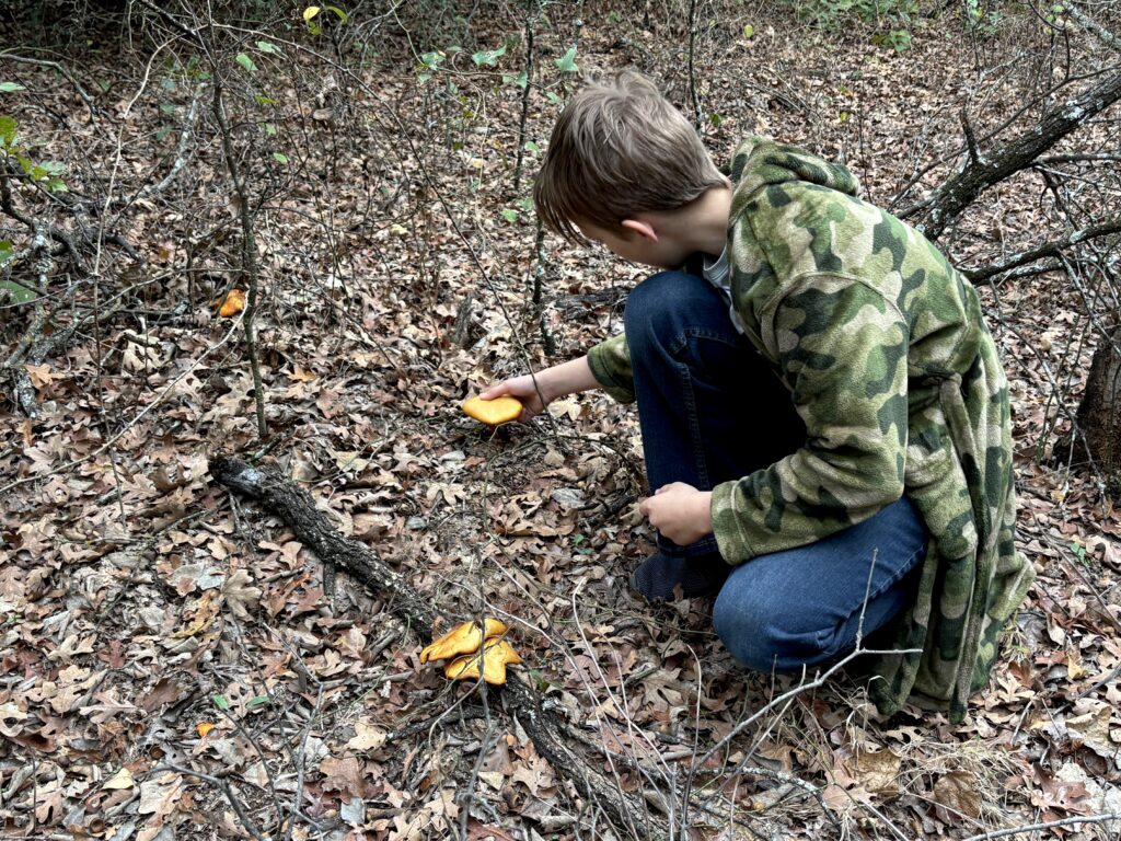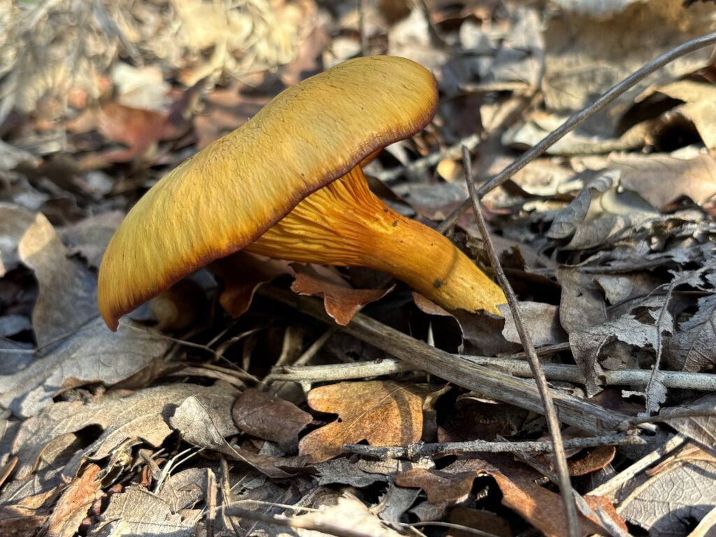 Logan wanted to know if it was edible, so I looked it up using iNaturalist and found that it is poisonous. Not like a death cap mushroom that might be fatal, but the jack o’ lantern would give you the sort of upset stomach that one website said might “make you wish you were dead.” Definitely a mushroom to admire and leave just where it is.