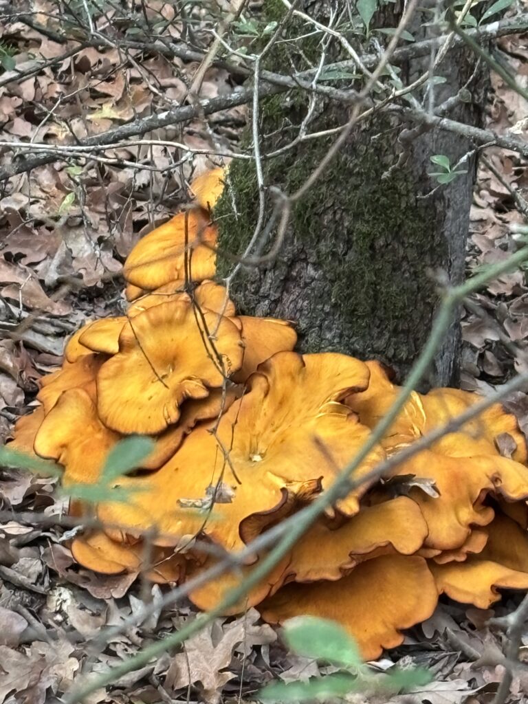 The “southern jack o’ lantern” is a large mushroom that grows from wood, often in clusters at a fallen tree limb or at the base of a tree. They’re common from summer through autumn at Sheri Capehart Nature Preserve. It has been very dry from late summer through much of autumn, but now that rains have come, orange mushrooms are popping up.