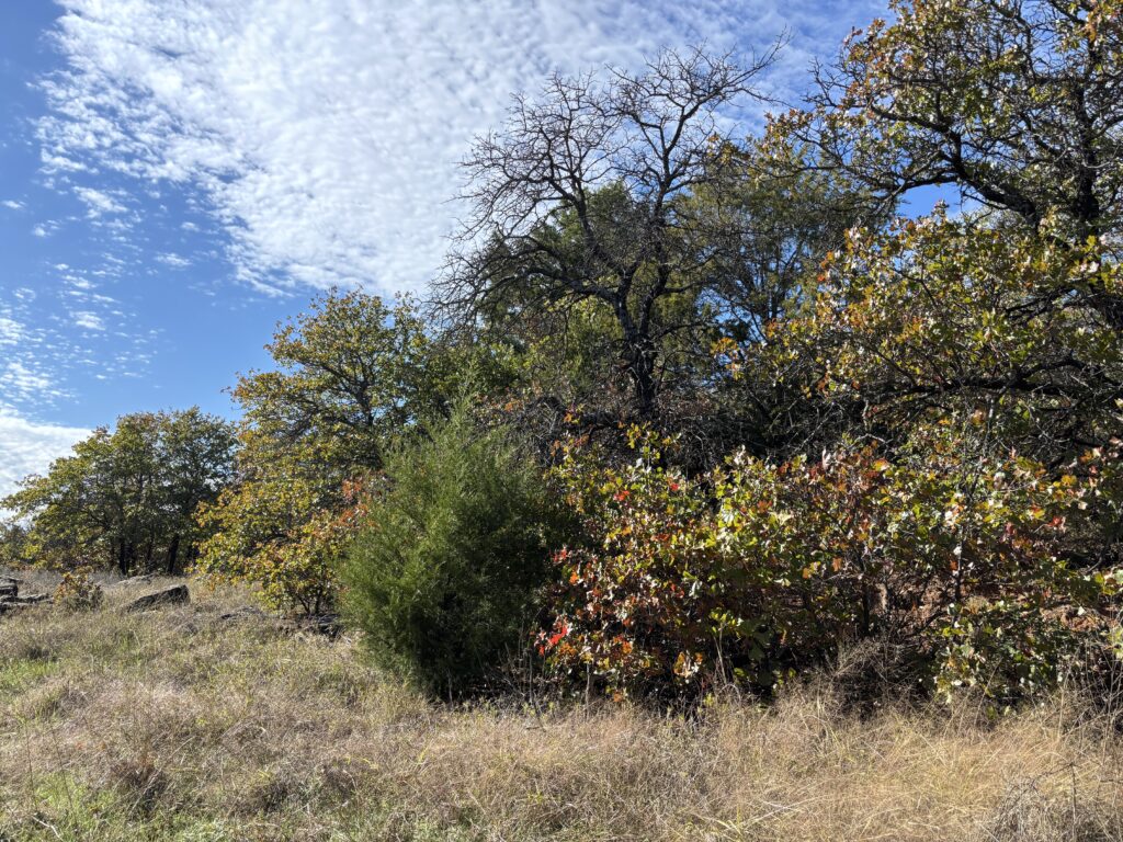 In my journal I wrote “Phenology Note” on a sketched calendar page and made a few notes about the trees and leaves. “The trees are still mostly leafed out and green. Many oak leaves are tinged with caramel …. Some trees look ragged but we’re still waiting for autumn color and/or leaf drop.” Back near the parking lot, many of the cedar elm trees are becoming bare, but the oaks seemed barely touched by autumn.