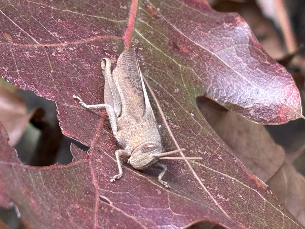 I kept walking, looking and listening for wildlife. A one-minute sample using the Merlin app detected no sounds of birds. I did find a delightful grasshopper resting on a leaf turned nicely red. Uploading a photo to the nature app iNaturalist, the insect was identified as a “mischievous bird grasshopper.”