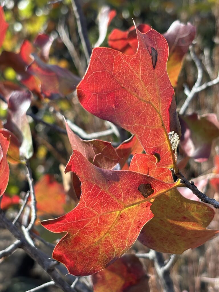 Backlit fire-red blackjack leaves