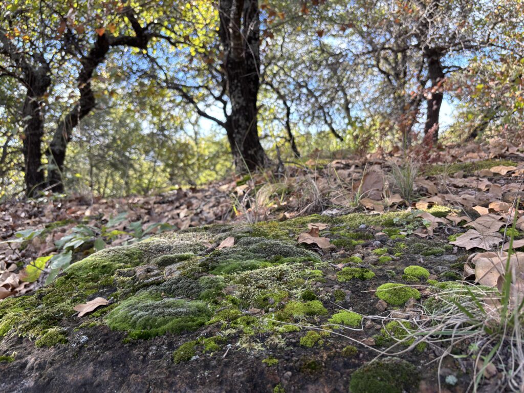 Mosses can survive periods of drought to an amazing degree, seeming to spring back to life after a rain. At the top of the preserve there are many partially-shaded places where mosses grow. In the heat of summer, especially when it is quite dry, they become dark green crusts along the rocks, waiting for rain. Then, the plant’s cells fill with fluid and they become green and springy.